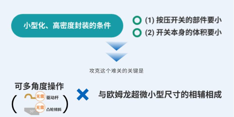 實現(xiàn)(1)和(2)最簡單的方法就是從正上方按壓,也就是從行程(完全按下開關(guān)的距離)最短的角度按壓。但要設(shè)計行程只有幾毫米的超微小型開關(guān)的垂直按壓并不容易。