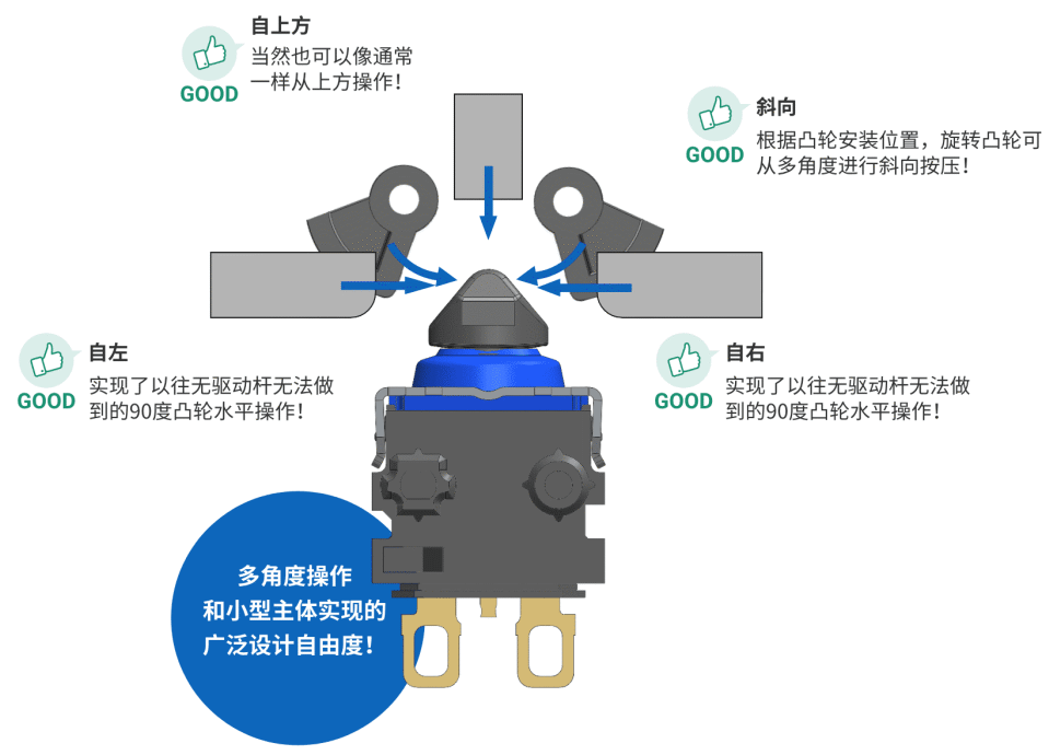 D2EW開關(guān)通過歐姆龍全新研發(fā)的獨特按鈕形狀,無需驅(qū)動桿、無需傾斜水平凸輪即可從水平方向進(jìn)行操作。除了水平方向,還可從其他角度進(jìn)行操作。(參照下圖)