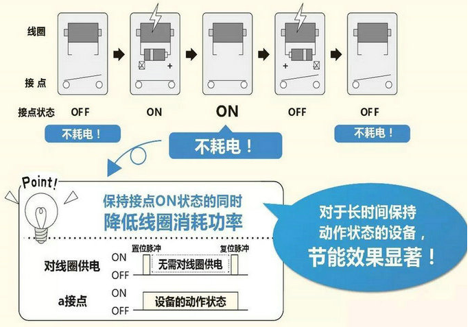 鎖定功能:在施加線圈電壓時將接點置ON或OFF即使斷開線圈電壓依然保持該狀態(tài)的功能。在設(shè)備的動作狀態(tài)下降低線圈消耗功率,為節(jié)能作出貢獻(xiàn)。