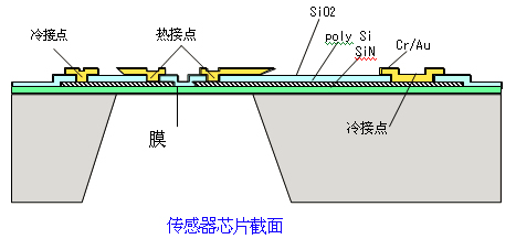 利用賽貝克效應(2種不同金屬接點間的溫度差而產生的溫差電動勢)。使用n型Poly Si、p型Poly Si作為材料進行熱電對接形成熱電堆。在熱絕緣性良好的介電薄膜上加載熱接點,在熱傳導性良好的硅材料上加載冷接點,通過高速對應實現高功率的能量轉換(紅外線—溫度--溫差電動勢)。