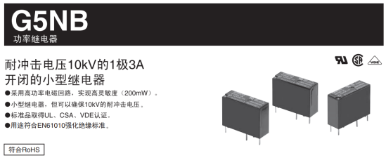 歐姆龍G5NB是一款耐沖擊電壓為10kV的1極3A/5A開閉的小型繼電器,該器件采用了高功率電磁回路,能夠?qū)崿F(xiàn)高達200mW的靈敏度。并且歐姆龍G5NB繼電器已經(jīng)取得了UL、CSA、VDE認證,產(chǎn)品用途符合EN61010強化絕緣標準。