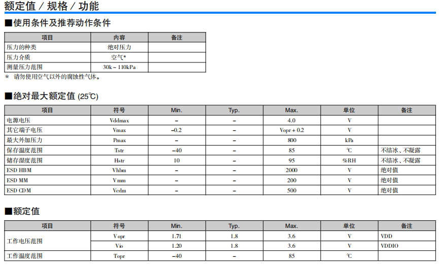 高精度·低消耗電流的小型MEMS絕對壓力傳感器 高精度地測量氣壓 內(nèi)置低干擾的24bit ADC 基于I2C/SPI 接口的數(shù)字控制/輸出 在自動睡眠模式下實(shí)現(xiàn)低消耗電流 單獨(dú)的補(bǔ)償系數(shù)保存在OTP*中 (* One Time Programmable - ROM)